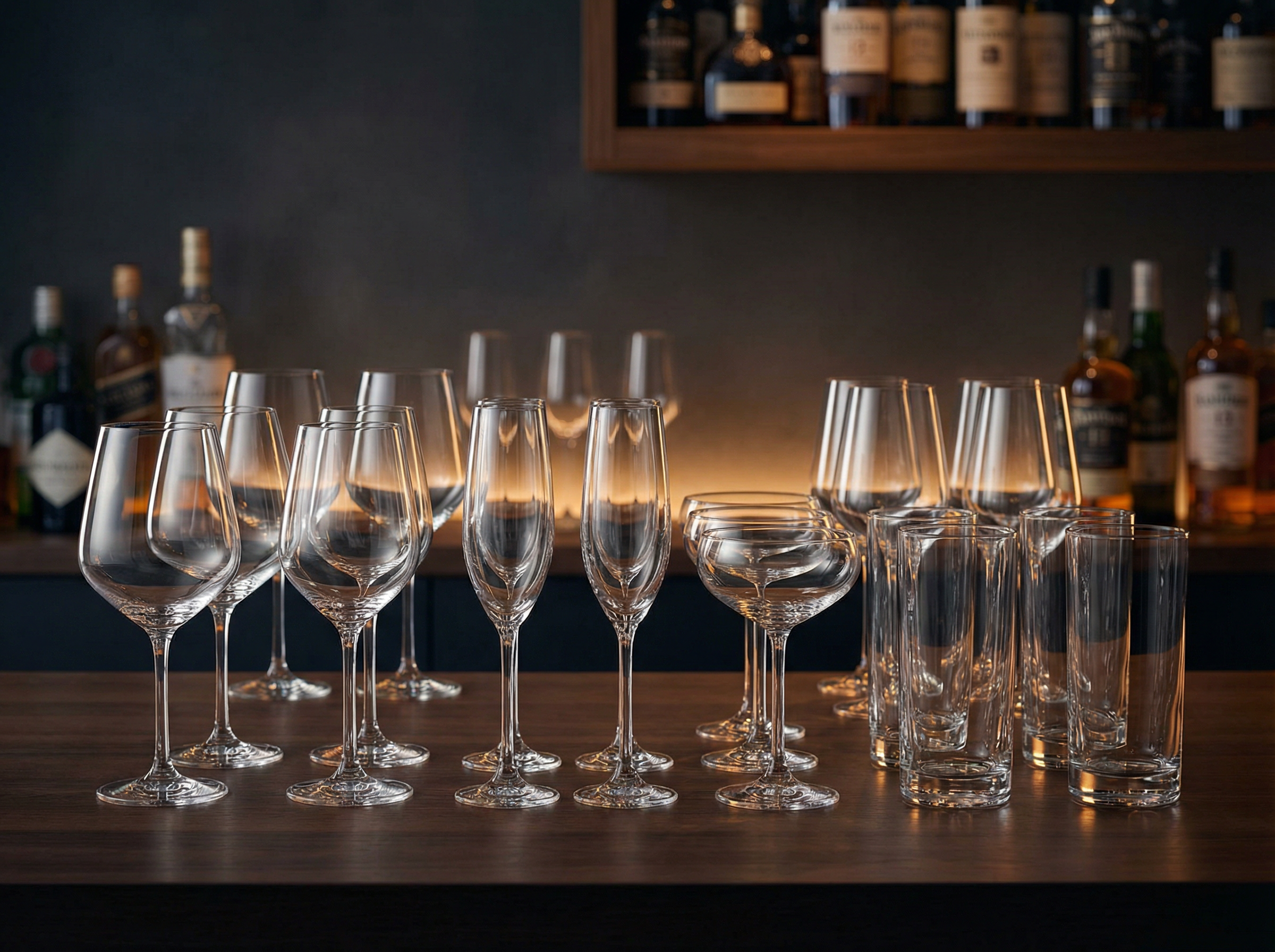 Premium glassware for every occasion — wine glasses, champagne flutes, cocktail coupes, and highball glasses, all polished and ready for your event.