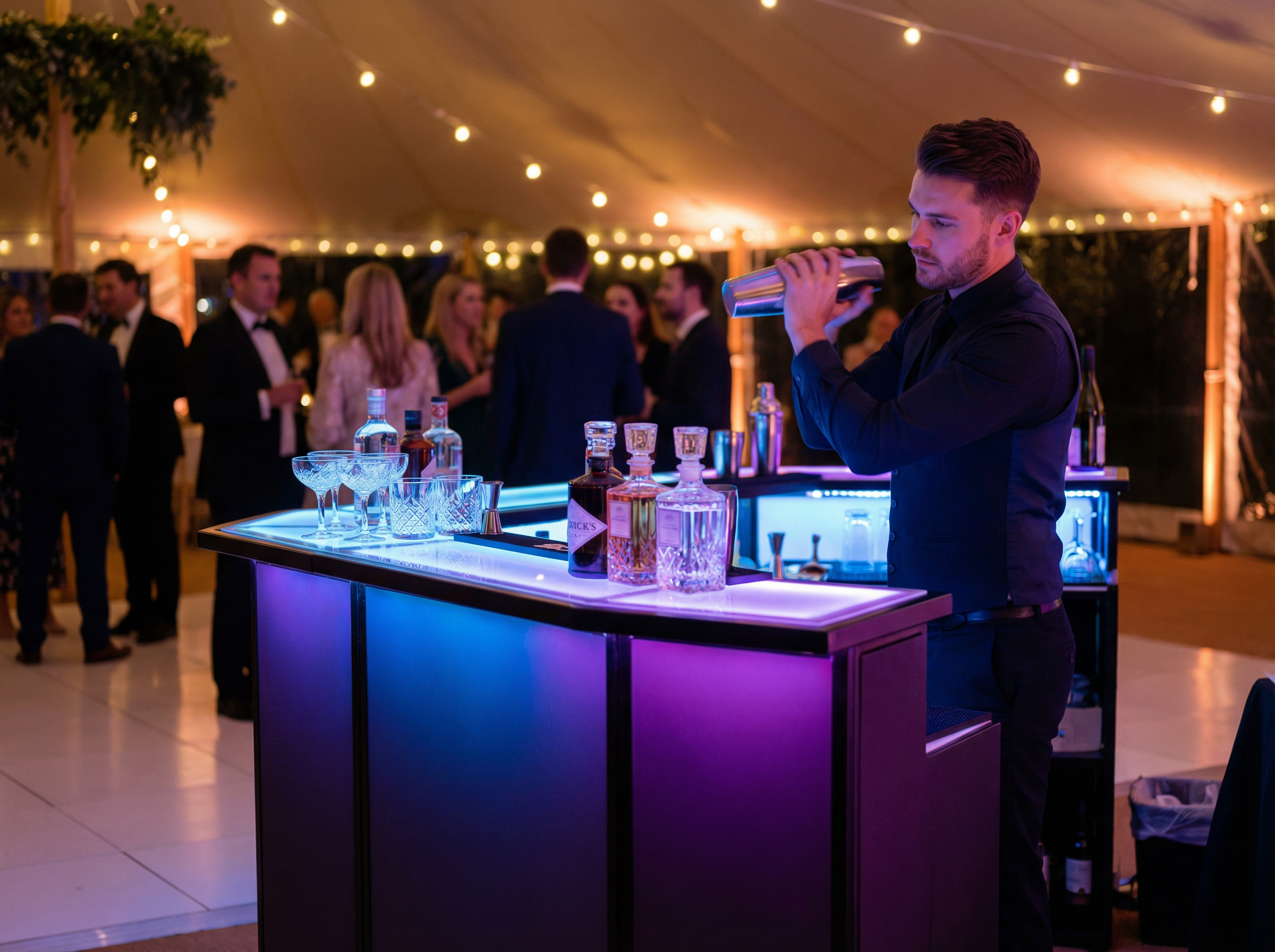 LED bars customisable to your theme — dry hire or fully stocked and served.